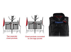 - Gepatenteerde, omvormbare borstzak (één grote borstzak of twee aparte borstzakken) met een pull-to-open systeem